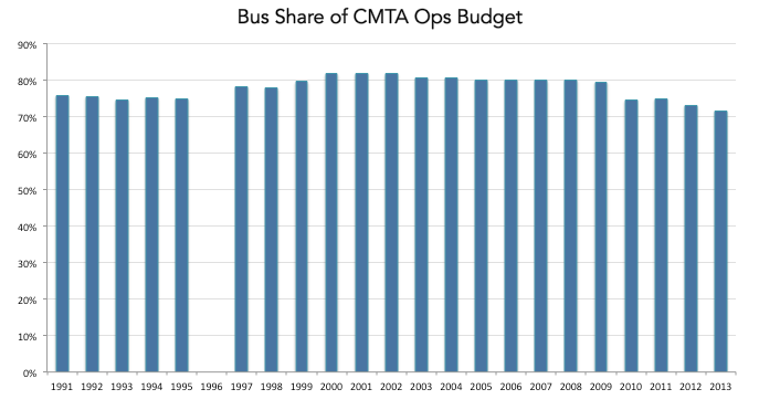 Further reducing CapMetro's productivity is the shift of resources into the high-subsidy Red Line commuter rail. As the chart below shows, bus operations receive a smaller share of CapMetro's budget once the Red Line launches. All of those commuter rail dollars trade-off with the frequency that Taylor et al. cites as boosting ridership; and they also contribute to the need for higher fares that Taylor el al. found to decrease ridership.