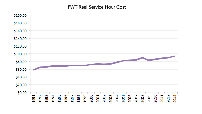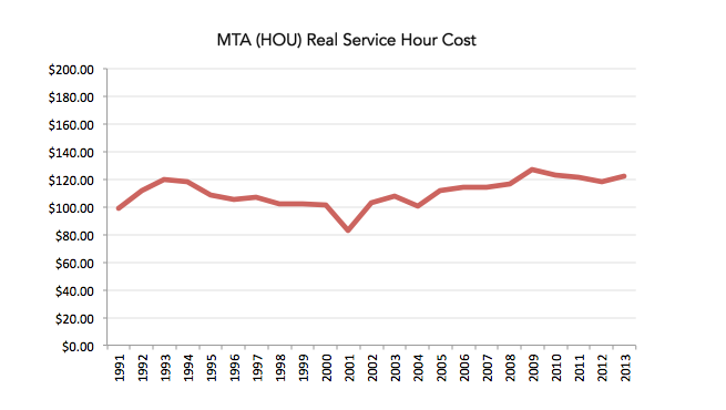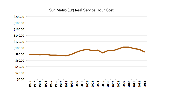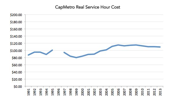 The diversity of cost trajectories for bus operations shows that each transit agency is unique. At CapMetro, the period between 1999 and 2006 featured the agency losing its low-cost delivery structure as its per-hour cost ballooned past the average cost, where it's remained. This loss of purchasing power due to contractual and management choices - from $80 per hour in 2015 real dollars in 1999 to $110 real dollars for the present hour cost - is a major explanation for the difficulty in providing additional service hours.