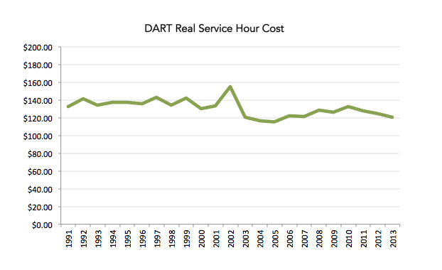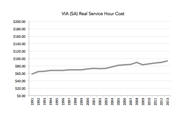 It's possible that CapMetro's deterioration in purchasing power is some kind of widespread trend across transit agencies. Examining the real dollar bus service costs for the largest Texas transit agencies undermines the validity of that explanation. The data below is only for bus and rapid bus/BRT expenses and vehicle revenue ('in service, taking fare revenue') hours.