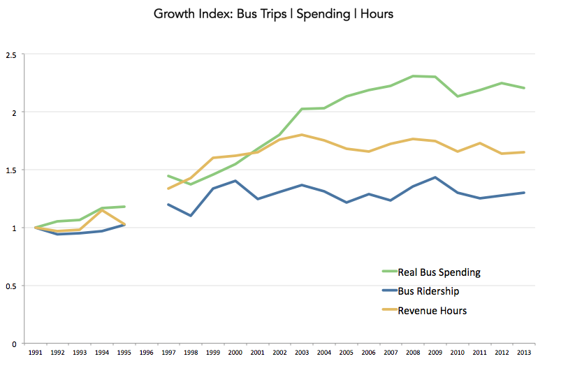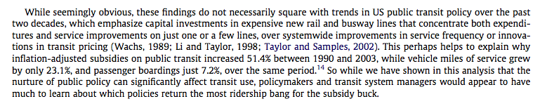 To determine the value added by agency management, one needs a model that spits out expected ridership or mode share given validated predictive factors. If an agency's outcomes exceed the expected R&MS, then it's likely the management is creating value. If the agency outcomes are substantially below the expected R&MS, then it's likely the management is destroying value. Taylor et al.'s research indicates that developing such a model is feasible.