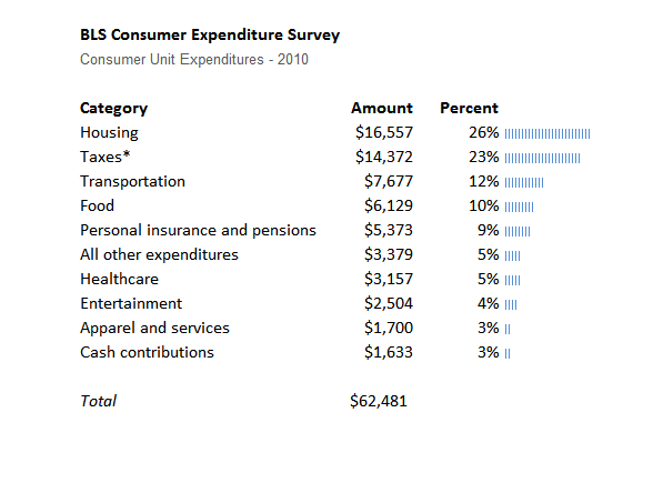 To answer the first question, let’s examine what Austinites might spend their money on. Below is a summary of the latest data from the Bureau of Labor statistics on American consumer expenditures. The major categories are housing, tax expenditures (this includes federal taxes but not local sales taxes), and transportation.