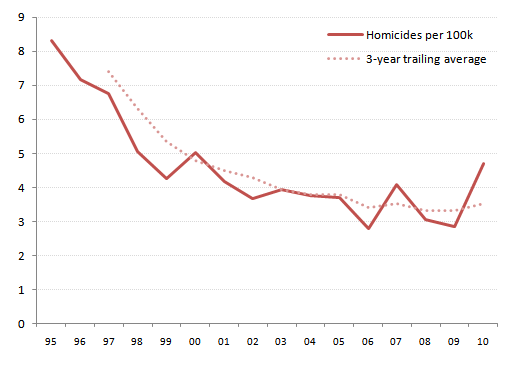 The Statesman recently highlighted an increase in homicides from 22 in '09 to 37 in '10. While the piece provided a compelling visualization with the long-term count of homicides in Austin, it did not provide data that adjusted for the city's population growth. In the chart below, I provide the number of homicides per 100,000 residents within the city's total area, as well as a 3-year trailing average.