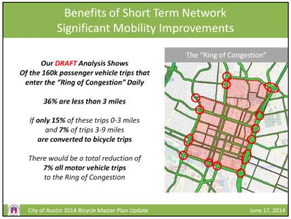 Within the core, bicycling has tremendous potential as a cost-competitive substitute for car commutes and other short trips. Remember, bike work commutes are almost at 2%, which is essentially the same as public transportation work commutes.
