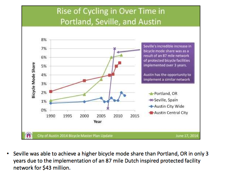 The Bicycle Master Plan is one component of the Urban Trails Master Plan; it includes 200 miles of on-street bike lanes at a cost of $66 million. This recent slide discussing the Bike Master Plan outlines its potential impact.