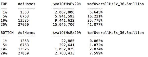 You can find the information for many of your suggestions in Volume I of the Proposed Budget. For example, the change in property value by property type is listed on page 24. [Unfortunately, these charts are not broken out into deciles, so the budget reader can't tell where in the distribution significant changes in value occurred. Here's an example of what I was referring to based on Dylan Tynan's calculations:
