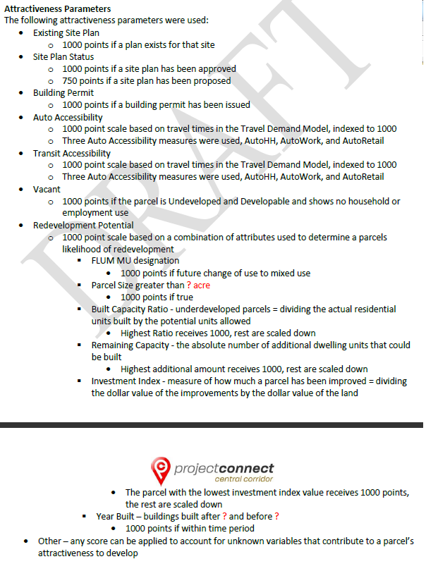 The demographic allocation methodology begins by looking at the expected CAMPO growth totals across the region's counties for 2035 and then allocates it across Austin parcels. Each parcel in the study area is rated on ‘attractiveness’ and placed into a bin of similarly attractive parcels. The precise methodology for the attractiveness calculation is not fully clear as the released explanatory document for the first attractiveness algorithm - there's a second one subsequent to this one - has some quirky notes in it: