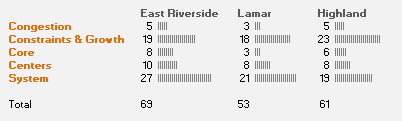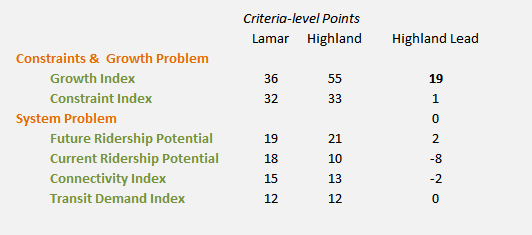 For those not closely following the PC recommendation, it utilized a set of synthesized indices to differentiate the sub-corridors. The main index had a set of 'problems' it covered and each sub-corridor got a set of points for that problem. As the chart above illustrates, Highland got the bulk of its problem-level points in two problem areas: (1) ‘Constraints & Growth’ and (2) ‘System’.