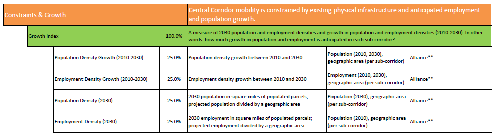 The use of both population and employment density growth projections is problematic. It is unclear from the released documentation if the PC team scored either the rate ("32% growth from the 2010 base") or the count ("1377 more people per square mile than in 2010") of density growth. Either way, this leads to points being scored by a metric that is tangential to transit success.
