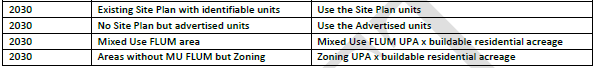 The total growth from CAMPO projections was then divided into the bins and subsequently allocated to the parcels. The parcels in each bin received growth up to their capacity until the growth increment in the bin was depleted. ‘Capacity’ for 2030 – and this is absolutely key - was determined by the likely maximum household count for the parcel as a result of the rules below: