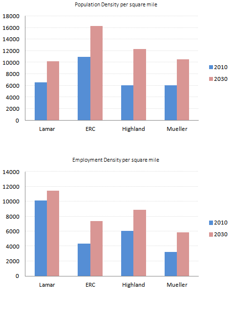 Remember that the Project Connect staff chose to remove West Campus from the Lamar sub-corridor as a way of indicating that ‘the University would be served as part of the Core’. That choice, however, obscures that a real-world Lamar alignment would serve high density West Campus. Even with that suspicion-arousing omission, Lamar is still presently competitive with both Highland and Mueller on population density and dominates on employment density.