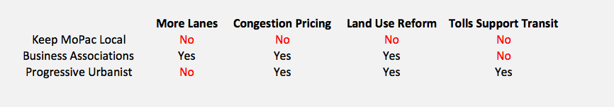 For example, in this south MoPac debate, "Keep MoPac Local" - the umbrella coalition of Austin environmental groups - argues against new capacity and tolls; many of its member organizations and leaders support low residential density policies and candidates.