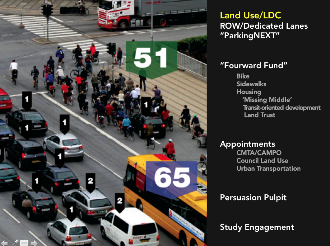 Finally, Council must be mindful of its appointments (especially to its land use commissions, as well as CMTA) and how it staffs the many 'studies' undertaken by the different agencies to ensure that competing stakeholder priorities (e.g. roads, more commuter rail) don't undermine a focus on wisely using scare resources to boost bus ridership.