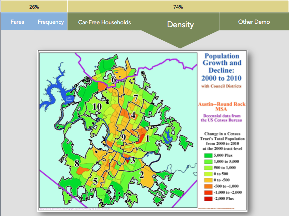 Where does responsibility lie for improving the productivity of the service hours we can buy? Research (PDF) by UCLA's Brian Taylor et al. indicates that about 26% of the per capita transit ridership variance across communities can be explained by two choices made within transit agencies. Low fares and frequent service boosted ridership when controlling for other factors. So that leaves the other 74% to account for. The point I made to Council is that two of the most important factors external to transit management are within their control: land use and support for car-free/car-lite households.
