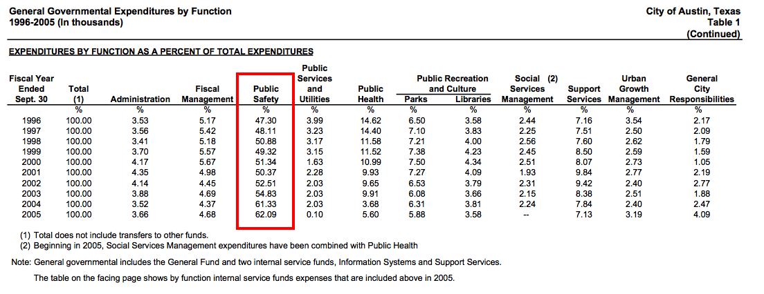 Public safety has grown dramatically as a share of total City government spending. The shift happened between 1995-2005. This table is from the 2005 City of Austin Comprehensive Annual Financial Report.