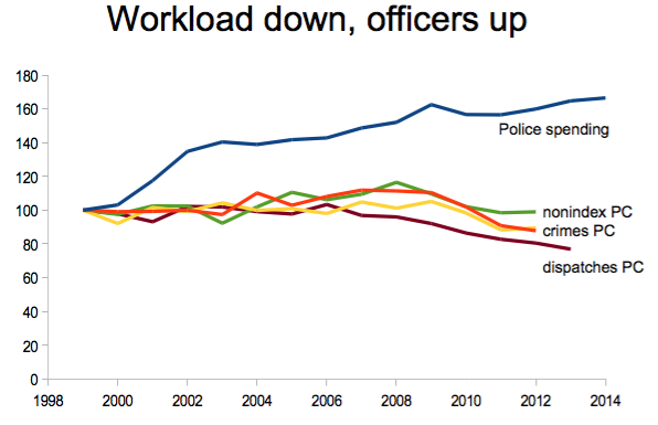 Given the importance of CFS to patrol work, it was odd that the PERF study didn't feature any data on the number of calls handled over time. As former Council Member Bill Spelman pointed out (PDF), dispatches per capita decreased over the last decade.
